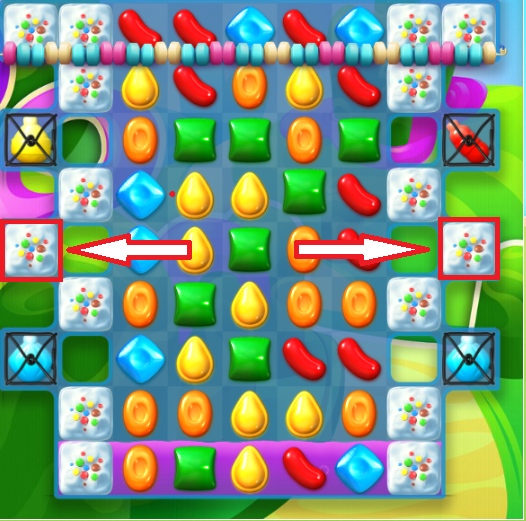 You should concentrate on clearing these 2 squares using stripes and stripe/wrap combos. If you can't hit those squares make sure you hit other cupcake blockers with every move.